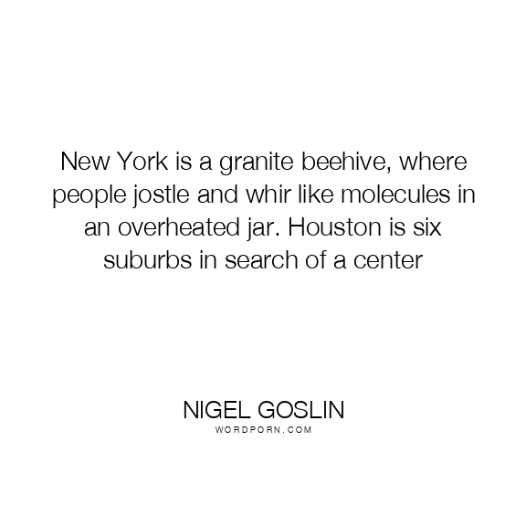 Copy Image New York is a granite beehive, where people jostle and whir like molecules in an overheated jar. Houston is six suburbs in search of a center Moms Typewriter A A SAVE THIS IMAGE