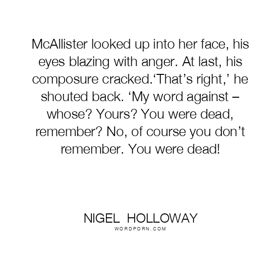 McAllister looked up into her face, his eyes blazing with anger. At last, his composure cracked.‘That’s right,’ he shouted back. ‘My word against – whose? Yours? You were dead, remember? No, of course you don’t remember. You were dead!