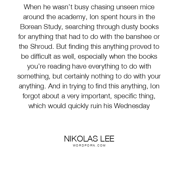 When he wasn’t busy chasing unseen mice around the academy, Ion spent hours in the Borean Study, searching through dusty books for anything that had to do with the banshee or the Shroud. But finding this anything proved to be difficult as well, especially when the books you’re reading have everything to do with something, but certainly nothing to do with your anything. And in trying to find this anything, Ion forgot about a very important, specific thing, which would quickly ruin his Wednesday