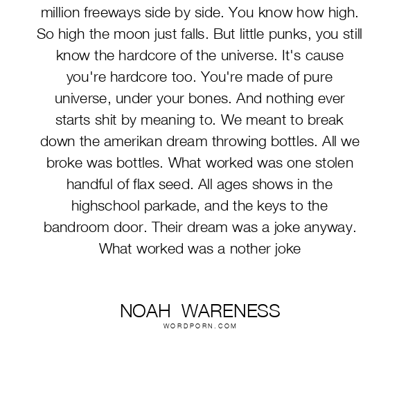 You know how long's the universe. It's seven million freeways side by side. You know how high. So high the moon just falls. But little punks, you still know the hardcore of the universe. It's cause you're hardcore too. You're made of pure universe, under your bones. And nothing ever starts shit by meaning to. We meant to break down the amerikan dream throwing bottles. All we broke was bottles. What worked was one stolen handful of flax seed. All ages shows in the highschool parkade, and the keys to the bandroom door. Their dream was a joke anyway. What worked was a nother joke
