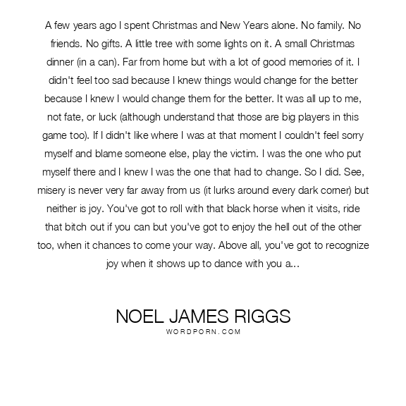 A few years ago I spent Christmas and New Years alone. No family. No friends. No gifts. A little tree with some lights on it. A small Christmas dinner (in a can). Far from home but with a lot of good memories of it. I didn't feel too sad because I knew things would change for the better because I knew I would change them for the better. It was all up to me, not fate, or luck (although understand that those are big players in this game too). If I didn't like where I was at that moment I couldn't feel sorry myself and blame someone else, play the victim. I was the one who put myself there and I knew I was the one that had to change. So I did. See, misery is never very far away from us (it lurks around every dark corner) but neither is joy. You've got to roll with that black horse when it visits, ride that bitch out if you can but you've got to enjoy the hell out of the other too, when it chances to come your way. Above all, you've got to recognize joy when it shows up to dance with you and, sorry, that's not nearly as easy as it sounds. You've got to fight tooth and nail in this life to try and be as happy as you can with the circumstances you've been given. You've got to fight with every inch of your being for that and grit your teeth and stick out your chin while you're doing it too because although without a doubt it's the right fight to be in, it's going to be hard sometimes. So hard that maybe you'll be blind to everything else. Along the way however, always remember one thing: even though there are people out there in the world who will take the heart right out of you...there are those who will put it right back in again (let them). Learn to recognize who they are because that's something really worth knowing. But it's up to you in the end. It's up to you to embrace the wonders in this life and to deny the darkness (and there are plenty of both). Be strong, be brave, be kind, be noble and above all, slay your dragons and keep on moving. Don't stop. And finally, even if happiness forgets you for a little while, never completely forget about it. It's there waiting for the other to pass. Even in your darkest hour don't ever doubt that for a second