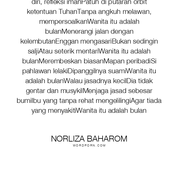 Seorang wanita adalah bulanMemancar cahaya diri, refleksi imanPatuh di putaran orbit ketentuan TuhanTanpa angkuh melawan, mempersoalkanWanita itu adalah bulanMenerangi jalan dengan kelembutanEnggan mengasariBukan sedingin saljiAtau seterik mentariWanita itu adalah bulanMerembeskan biasanMapan peribadiSi pahlawan lelakiDipanggilnya suamiWanita itu adalah bulanWalau jasadnya kecilDia tidak gentar dan musykilMenjaga jasad sebesar bumiIbu yang tanpa rehat mengelilingiAgar tiada yang menyakitiWanita itu adalah bulan