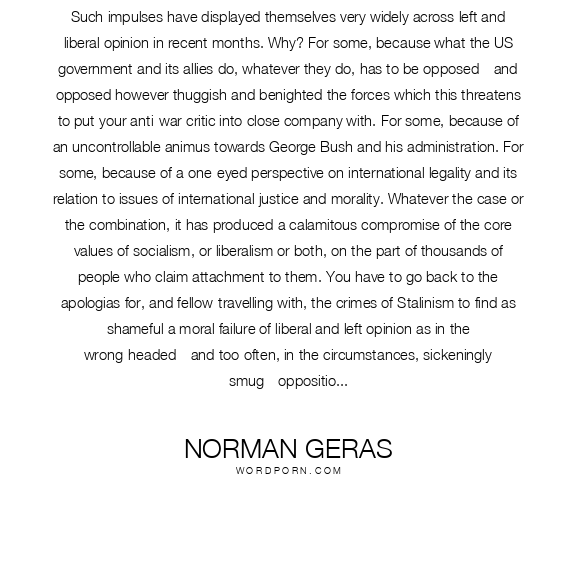 Such impulses have displayed themselves very widely across left and liberal opinion in recent months. Why? For some, because what the US government and its allies do, whatever they do, has to be opposed—and opposed however thuggish and benighted the forces which this threatens to put your anti-war critic into close company with. For some, because of an uncontrollable animus towards George Bush and his administration. For some, because of a one-eyed perspective on international legality and its relation to issues of international justice and morality. Whatever the case or the combination, it has produced a calamitous compromise of the core values of socialism, or liberalism or both, on the part of thousands of people who claim attachment to them. You have to go back to the apologias for, and fellow-travelling with, the crimes of Stalinism to find as shameful a moral failure of liberal and left opinion as in the wrong-headed—and too often, in the circumstances, sickeningly smug—opposition to the freeing of the Iraqi people from one of the foulest regimes on the planet