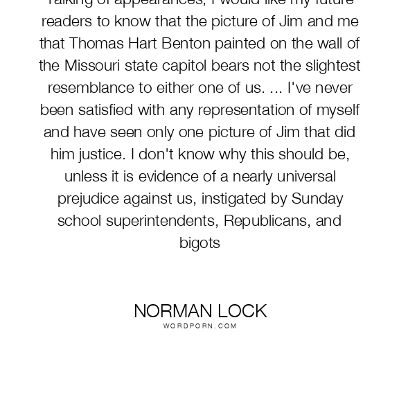 Talking of appearances, I would like my future readers to know that the picture of Jim and me that Thomas Hart Benton painted on the wall of the Missouri state capitol bears not the slightest resemblance to either one of us. ... I've never been satisfied with any representation of myself and have seen only one picture of Jim that did him justice. I don't know why this should be, unless it is evidence of a nearly universal prejudice against us, instigated by Sunday school superintendents, Republicans, and bigots