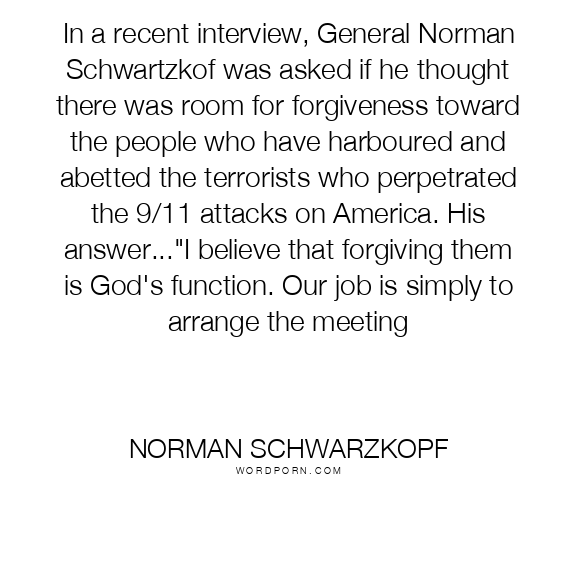 In a recent interview, General Norman Schwartzkof was asked if he thought there was room for forgiveness toward the people who have harboured and abetted the terrorists who perpetrated the 9/11 attacks on America. His answer..."I believe that forgiving them is God's function. Our job is simply to arrange the meeting