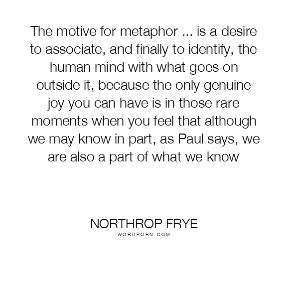 The motive for metaphor ... is a desire to associate, and finally to identify, the human mind with what goes on outside it, because the only genuine joy you can have is in those rare moments when you feel that although we may know in part, as Paul says, we are also a part of what we know