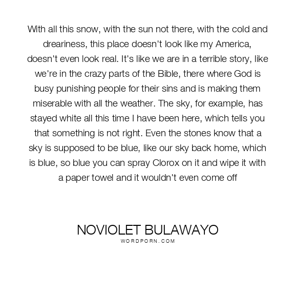 With all this snow, with the sun not there, with the cold and dreariness, this place doesn't look like my America, doesn't even look real. It's like we are in a terrible story, like we're in the crazy parts of the Bible, there where God is busy punishing people for their sins and is making them miserable with all the weather. The sky, for example, has stayed white all this time I have been here, which tells you that something is not right. Even the stones know that a sky is supposed to be blue, like our sky back home, which is blue, so blue you can spray Clorox on it and wipe it with a paper towel and it wouldn't even come off