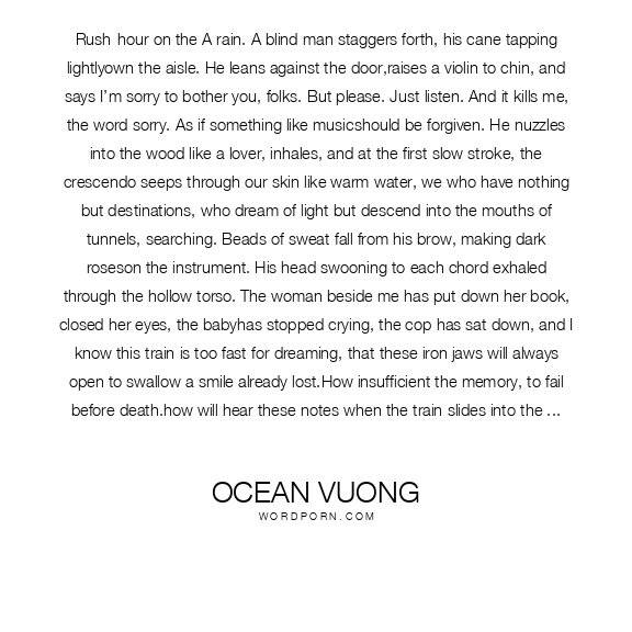 Rush-hour on the A rain. A blind man staggers forth, his cane tapping lightlyown the aisle. He leans against the door,raises a violin to chin, and says I’m sorry to bother you, folks. But please. Just listen. And it kills me, the word sorry. As if something like musicshould be forgiven. He nuzzles into the wood like a lover, inhales, and at the first slow stroke, the crescendo seeps through our skin like warm water, we who have nothing but destinations, who dream of light but descend into the mouths of tunnels, searching. Beads of sweat fall from his brow, making dark roseson the instrument. His head swooning to each chord exhaled through the hollow torso. The woman beside me has put down her book, closed her eyes, the babyhas stopped crying, the cop has sat down, and I know this train is too fast for dreaming, that these iron jaws will always open to swallow a smile already lost.How insufficient the memory, to fail before death.how will hear these notes when the train slides into the yard, the lights turned out, and the songlingers with breaths rising from empty seats? I know I am too human to praise what is fading. But for now, I just want to listen as the train fillscompletely with warm water, and we are all swimming slowly toward the man with Mozart flowing from his hands. I want nothingbut to put my fingers inside his mouth, let that prayer hum through my veins. I want crawl into the hole in his violin.I want to sleep there until my flesh becomes music