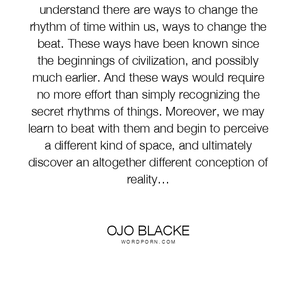 As researchers of the paranormal, we must understand there are ways to change the rhythm of time within us, ways to change the beat. These ways have been known since the beginnings of civilization, and possibly much earlier. And these ways would require no more effort than simply recognizing the secret rhythms of things. Moreover, we may learn to beat with them and begin to perceive a different kind of space, and ultimately discover an altogether different conception of reality…
