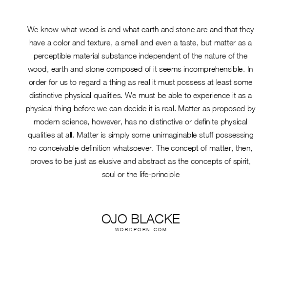 We know what wood is and what earth and stone are and that they have a color and texture, a smell and even a taste, but matter as a perceptible material substance independent of the nature of the wood, earth and stone composed of it seems incomprehensible. In order for us to regard a thing as real it must possess at least some distinctive physical qualities. We must be able to experience it as a physical thing before we can decide it is real. Matter as proposed by modern science, however, has no distinctive or definite physical qualities at all. Matter is simply some unimaginable stuff possessing no conceivable definition whatsoever. The concept of matter, then, proves to be just as elusive and abstract as the concepts of spirit, soul or the life-principle