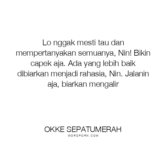 Copy Image Lo nggak mesti tau dan mempertanyakan semuanya, Nin! Bikin capek aja. Ada yang lebih baik dibiarkan menjadi rahasia, Nin. Jalanin aja, biarkan mengalir Moms Typewriter A A SAVE THIS IMAGE