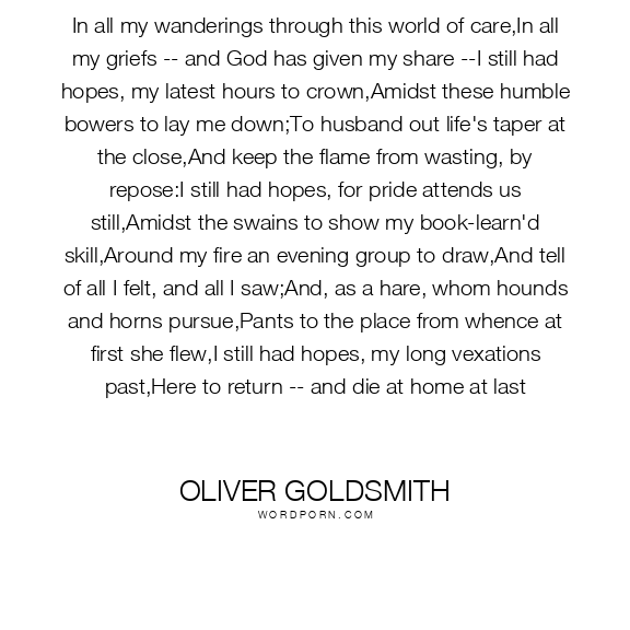 In all my wanderings through this world of care,In all my griefs -- and God has given my share --I still had hopes, my latest hours to crown,Amidst these humble bowers to lay me down;To husband out life's taper at the close,And keep the flame from wasting, by repose:I still had hopes, for pride attends us still,Amidst the swains to show my book-learn'd skill,Around my fire an evening group to draw,And tell of all I felt, and all I saw;And, as a hare, whom hounds and horns pursue,Pants to the place from whence at first she flew,I still had hopes, my long vexations past,Here to return -- and die at home at last