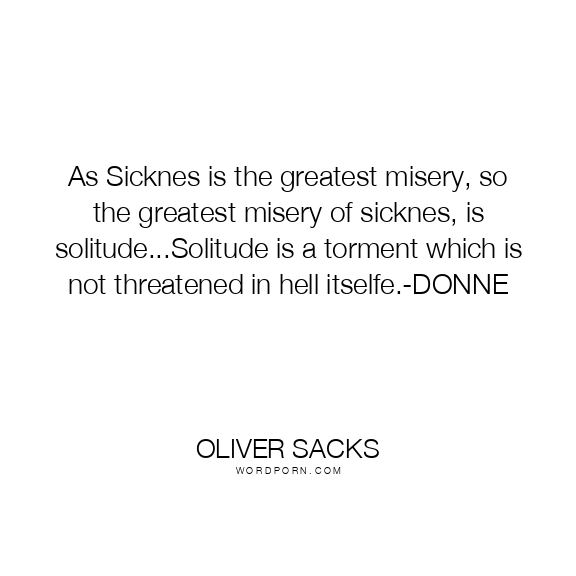 As Sicknes is the greatest misery, so the greatest misery of sicknes, is solitude...Solitude is a torment which is not threatened in hell itselfe.-DONNE
