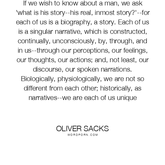 If we wish to know about a man, we ask 'what is his story--his real, inmost story?'--for each of us is a biography, a story. Each of us is a singular narrative, which is constructed, continually, unconsciously, by, through, and in us--through our perceptions, our feelings, our thoughts, our actions; and, not least, our discourse, our spoken narrations. Biologically, physiologically, we are not so different from each other; historically, as narratives--we are each of us unique