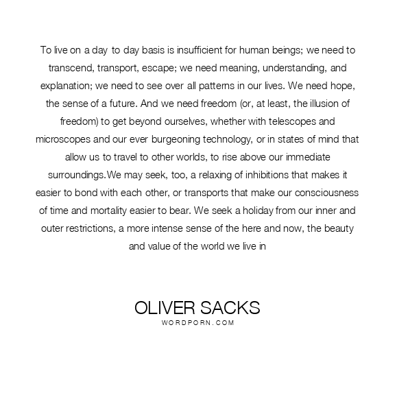 To live on a day-to-day basis is insufficient for human beings; we need to transcend, transport, escape; we need meaning, understanding, and explanation; we need to see over-all patterns in our lives. We need hope, the sense of a future. And we need freedom (or, at least, the illusion of freedom) to get beyond ourselves, whether with telescopes and microscopes and our ever-burgeoning technology, or in states of mind that allow us to travel to other worlds, to rise above our immediate surroundings.We may seek, too, a relaxing of inhibitions that makes it easier to bond with each other, or transports that make our consciousness of time and mortality easier to bear. We seek a holiday from our inner and outer restrictions, a more intense sense of the here and now, the beauty and value of the world we live in