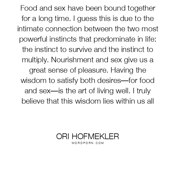 Food and sex have been bound together for a long time. I guess this is due to the intimate connection between the two most powerful instincts that predominate in life: the instinct to survive and the instinct to multiply. Nourishment and sex give us a great sense of pleasure. Having the wisdom to satisfy both desires—for food and sex—is the art of living well. I truly believe that this wisdom lies within us all