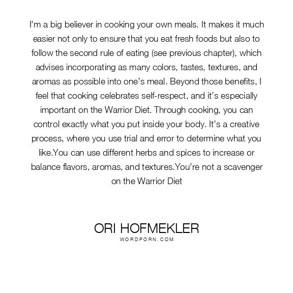 I’m a big believer in cooking your own meals. It makes it much easier not only to ensure that you eat fresh foods but also to follow the second rule of eating (see previous chapter), which advises incorporating as many colors, tastes, textures, and aromas as possible into one’s meal. Beyond those benefits, I feel that cooking celebrates self-respect, and it’s especially important on the Warrior Diet. Through cooking, you can control exactly what you put inside your body. It’s a creative process, where you use trial and error to determine what you like.You can use different herbs and spices to increase or balance flavors, aromas, and textures.You’re not a scavenger on the Warrior Diet