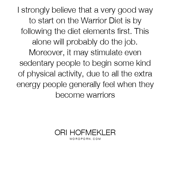 I strongly believe that a very good way to start on the Warrior Diet is by following the diet elements first. This alone will probably do the job. Moreover, it may stimulate even sedentary people to begin some kind of physical activity, due to all the extra energy people generally feel when they become warriors