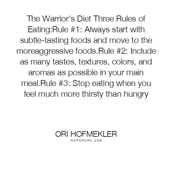 The Warrior's Diet Three Rules of Eating:Rule #1: Always start with subtle-tasting foods and move to the moreaggressive foods.Rule #2: Include as many tastes, textures, colors, and aromas as possible in your main meal.Rule #3: Stop eating when you feel much more thirsty than hungry