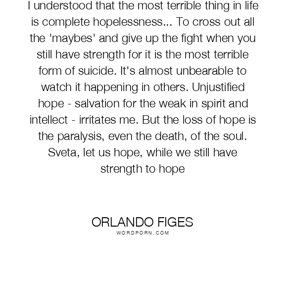 I understood that the most terrible thing in life is complete hopelessness... To cross out all the 'maybes' and give up the fight when you still have strength for it is the most terrible form of suicide. It's almost unbearable to watch it happening in others. Unjustified hope - salvation for the weak in spirit and intellect - irritates me. But the loss of hope is the paralysis, even the death, of the soul. Sveta, let us hope, while we still have strength to hope