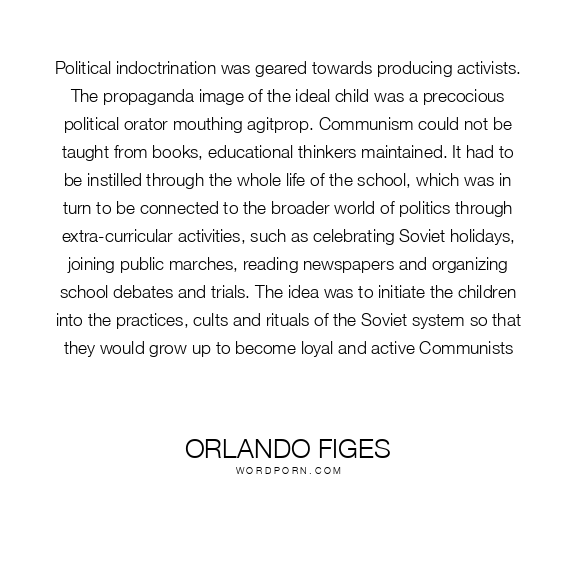 Political indoctrination was geared towards producing activists. The propaganda image of the ideal child was a precocious political orator mouthing agitprop. Communism could not be taught from books, educational thinkers maintained. It had to be instilled through the whole life of the school, which was in turn to be connected to the broader world of politics through extra-curricular activities, such as celebrating Soviet holidays, joining public marches, reading newspapers and organizing school debates and trials. The idea was to initiate the children into the practices, cults and rituals of the Soviet system so that they would grow up to become loyal and active Communists
