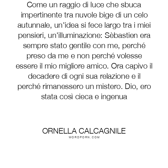 Come un raggio di luce che sbuca impertinente tra nuvole bige di un celo autunnale, un'idea si fece largo tra i miei pensieri, un'illuminazione: Sèbastien era sempre stato gentile con me, perché preso da me e non perché volesse essere il mio migliore amico. Ora capivo il decadere di ogni sua relazione e il perché rimanessero un mistero. Dio, ero stata così cieca e ingenua