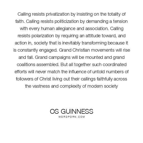 Calling resists privatization by insisting on the totality of faith. Calling resists politicization by demanding a tension with every human allegiance and association. Calling resists polarization by requiring an attitude toward, and action in, society that is inevitably transforming because it is constantly engaged. Grand Christian movements will rise and fall. Grand campaigns will be mounted and grand coalitions assembled. But all together such coordinated efforts will never match the influence of untold numbers of followers of Christ living out their callings faithfully across the vastness and complexity of modern society