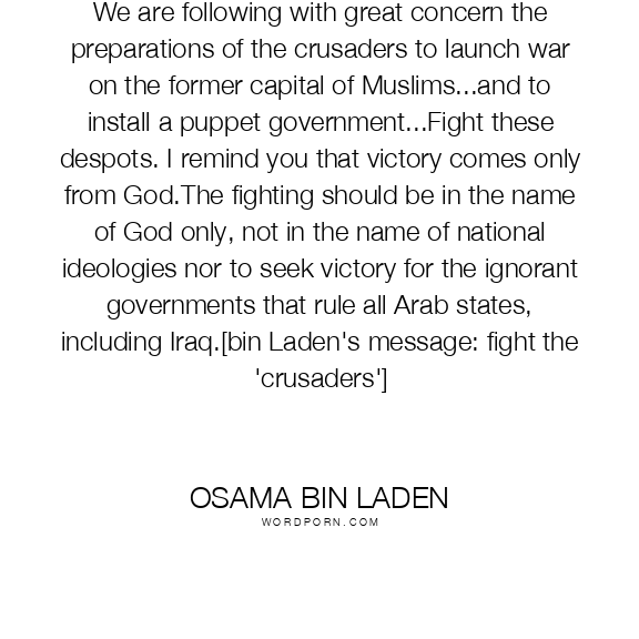 We are following with great concern the preparations of the crusaders to launch war on the former capital of Muslims...and to install a puppet government...Fight these despots. I remind you that victory comes only from God.The fighting should be in the name of God only, not in the name of national ideologies nor to seek victory for the ignorant governments that rule all Arab states, including Iraq.[bin Laden's message: fight the 'crusaders']