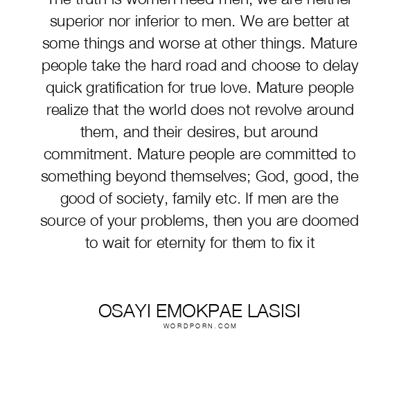 The truth is women need men, we are neither superior nor inferior to men. We are better at some things and worse at other things. Mature people take the hard road and choose to delay quick gratification for true love. Mature people realize that the world does not revolve around them, and their desires, but around commitment. Mature people are committed to something beyond themselves; God, good, the good of society, family etc. If men are the source of your problems, then you are doomed to wait for eternity for them to fix it