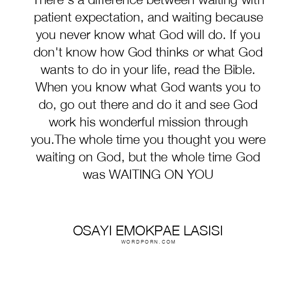 There's a difference between waiting with patient expectation, and waiting because you never know what God will do. If you don't know how God thinks or what God wants to do in your life, read the Bible. When you know what God wants you to do, go out there and do it and see God work his wonderful mission through you.The whole time you thought you were waiting on God, but the whole time God was WAITING ON YOU
