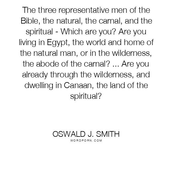 The three representative men of the Bible, the natural, the carnal, and the spiritual - Which are you? Are you living in Egypt, the world and home of the natural man, or in the wilderness, the abode of the carnal? ... Are you already through the wilderness, and dwelling in Canaan, the land of the spiritual?