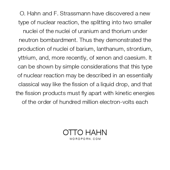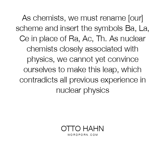 As chemists, we must rename [our] scheme and insert the symbols Ba, La, Ce in place of Ra, Ac, Th. As nuclear chemists closely associated with physics, we cannot yet convince ourselves to make this leap, which contradicts all previous experience in nuclear physics