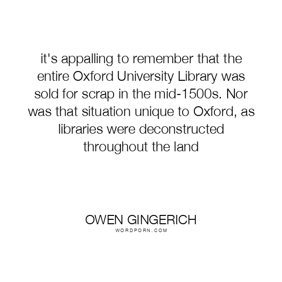 it's appalling to remember that the entire Oxford University Library was sold for scrap in the mid-1500s. Nor was that situation unique to Oxford, as libraries were deconstructed throughout the land