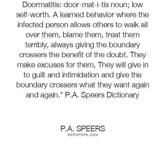 Doormatitis: door-mat-i-tis noun; low self-worth. A learned behavior where the infected person allows others to walk all over them, blame them, treat them terribly, always giving the boundary crossers the benefit of the doubt. They make excuses for them, They will give in to guilt and intimidation and give the boundary crossers what they want again and again." P.A. Speers Dictionary
