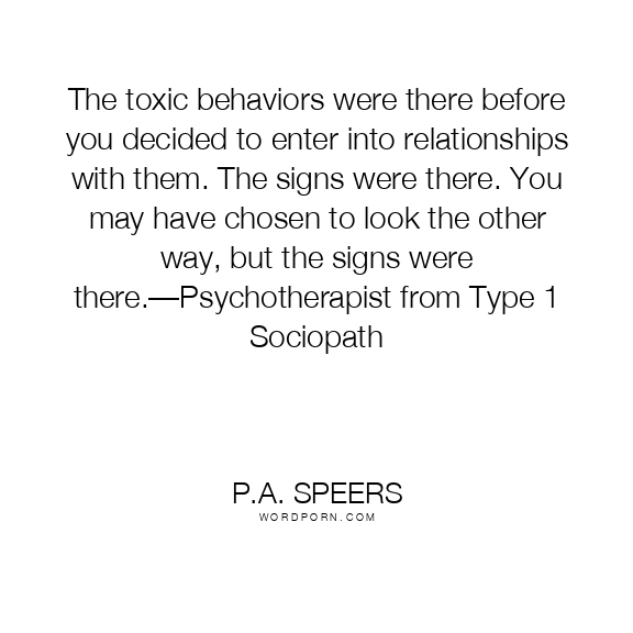 The toxic behaviors were there before you decided to enter into relationships with them. The signs were there. You may have chosen to look the other way, but the signs were there.—Psychotherapist from Type 1 Sociopath