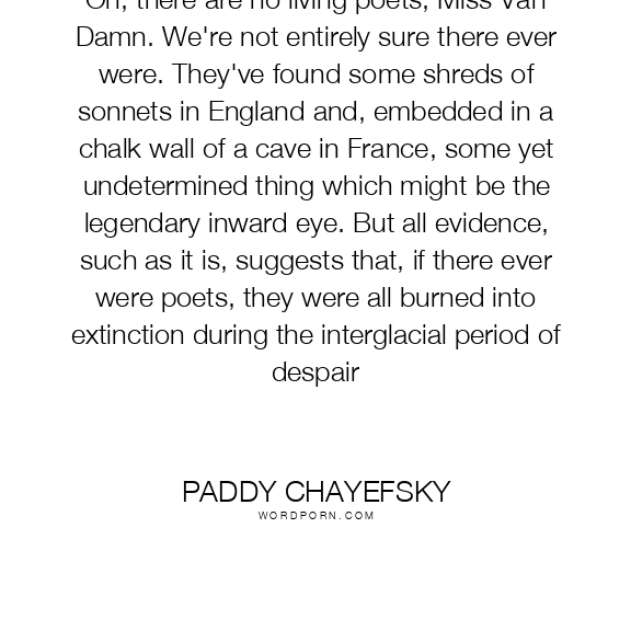 Oh, there are no living poets, Miss Van Damn. We're not entirely sure there ever were. They've found some shreds of sonnets in England and, embedded in a chalk wall of a cave in France, some yet undetermined thing which might be the legendary inward eye. But all evidence, such as it is, suggests that, if there ever were poets, they were all burned into extinction during the interglacial period of despair