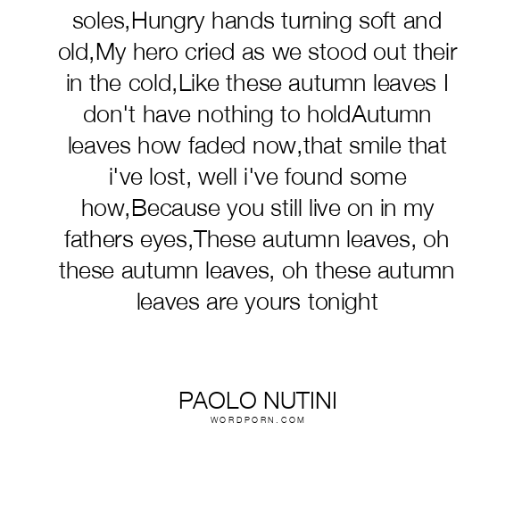 Autumn leaves under frozen soles,Hungry hands turning soft and old,My hero cried as we stood out their in the cold,Like these autumn leaves I don't have nothing to holdAutumn leaves how faded now,that smile that i've lost, well i've found some how,Because you still live on in my fathers eyes,These autumn leaves, oh these autumn leaves, oh these autumn leaves are yours tonight