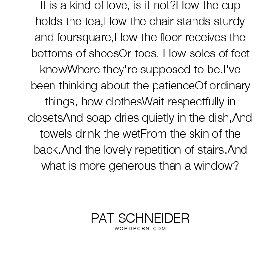 It is a kind of love, is it not?How the cup holds the tea,How the chair stands sturdy and foursquare,How the floor receives the bottoms of shoesOr toes. How soles of feet knowWhere they're supposed to be.I've been thinking about the patienceOf ordinary things, how clothesWait respectfully in closetsAnd soap dries quietly in the dish,And towels drink the wetFrom the skin of the back.And the lovely repetition of stairs.And what is more generous than a window?