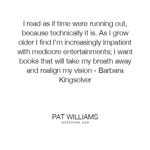 I read as if time were running out, because technically it is. As I grow older I find I'm increasingly impatient with mediocre entertainments; I want books that will take my breath away and realign my vision - Barbara Kingsolver