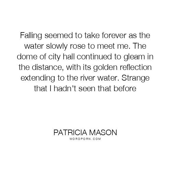 Falling seemed to take forever as the water slowly rose to meet me. The dome of city hall continued to gleam in the distance, with its golden reflection extending to the river water. Strange that I hadn't seen that before