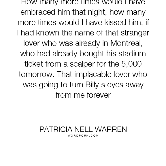 How many more times would I have embraced him that night, how many more times would I have kissed him, if I had known the name of that stranger lover who was already in Montreal, who had already bought his stadium ticket from a scalper for the 5,000 tomorrow. That implacable lover who was going to turn Billy's eyes away from me forever