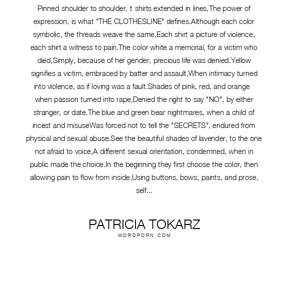 Pinned shoulder to shoulder, t-shirts extended in lines,The power of expression, is what "THE CLOTHESLINE" defines.Although each color symbolic, the threads weave the same,Each shirt a picture of violence, each shirt a witness to pain.The color white a memorial, for a victim who died,Simply, because of her gender, precious life was denied.Yellow signifies a victim, embraced by batter and assault,When intimacy turned into violence, as if loving was a fault.Shades of pink, red, and orange - when passion turned into rape,Denied the right to say "NO", by either stranger, or date.The blue and green bear nightmares, when a child of incest and misuseWas forced not to tell the "SECRETS", endured from physical and sexual abuse.See the beautiful shades of lavender, to the one not afraid to voice,A different sexual orientation, condemned, when in public made the choice.In the beginning they first choose the color, then allowing pain to flow from inside,Using buttons, bows, paints, and prose, self-expression no longer denied.As you walk through the line of color, emotional pain may fill your heart,But to the victim this personal creation, permits an inner healing to start.Pinned shoulder to shoulder, t-shirts extended in lines,The power of expression, is what "THE CLOTHESLINE" defines