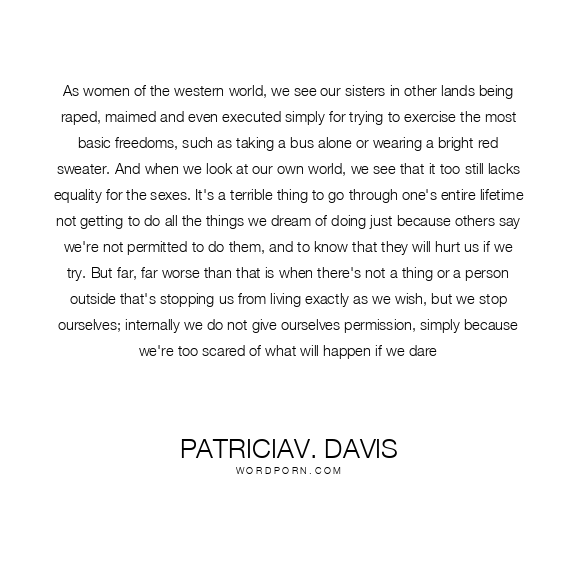 As women of the western world, we see our sisters in other lands being raped, maimed and even executed simply for trying to exercise the most basic freedoms, such as taking a bus alone or wearing a bright red sweater. And when we look at our own world, we see that it too still lacks equality for the sexes. It's a terrible thing to go through one's entire lifetime not getting to do all the things we dream of doing just because others say we're not permitted to do them, and to know that they will hurt us if we try. But far, far worse than that is when there's not a thing or a person outside that's stopping us from living exactly as we wish, but we stop ourselves; internally we do not give ourselves permission, simply because we're too scared of what will happen if we dare
