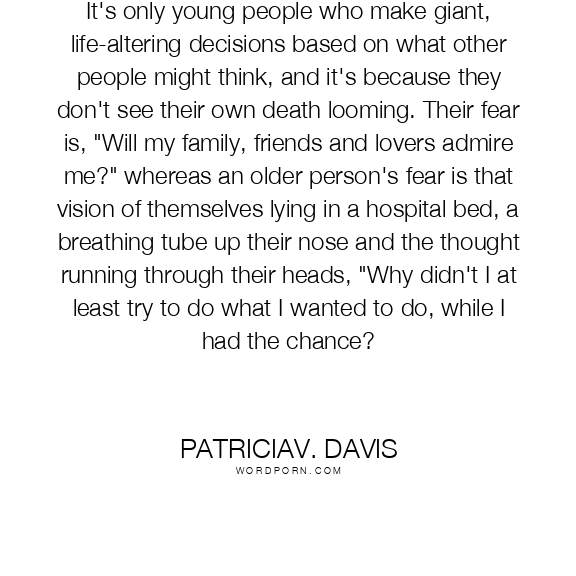 It's only young people who make giant, life-altering decisions based on what other people might think, and it's because they don't see their own death looming. Their fear is, "Will my family, friends and lovers admire me?" whereas an older person's fear is that vision of themselves lying in a hospital bed, a breathing tube up their nose and the thought running through their heads, "Why didn't I at least try to do what I wanted to do, while I had the chance?