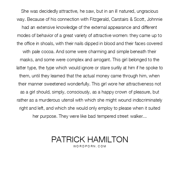 She was decidedly attractive, he saw, but in an ill-natured, ungracious way. Because of his connection with Fitzgerald, Carstairs & Scott, Johnnie had an extensive knowledge of the external appearance and different modes of behavior of a great variety of attractive women: they came up to the office in shoals, with their nails dipped in blood and their faces covered with pale cocoa. And some were charming and simple beneath their masks, and some were complex and arrogant. This girl belonged to the latter type, the type which would ignore or stare surlily at him if he spoke to them, until they learned that the actual money came through him, when their manner sweetened wonderfully. This girl wore her attractiveness not as a girl should, simply, consciously, as a happy crown of pleasure, but rather as a murderous utensil with which she might wound indiscriminately right and left, and which she would only employ to please when it suited her purpose. They were like bad-tempered street-walkers, without walking the street