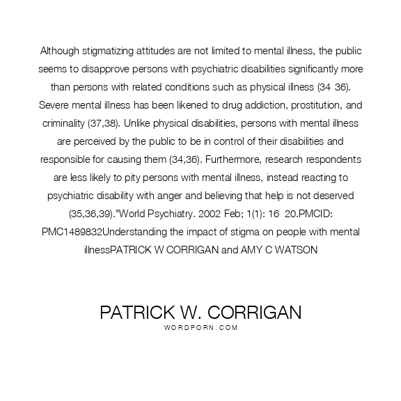 Although stigmatizing attitudes are not limited to mental illness, the public seems to disapprove persons with psychiatric disabilities significantly more than persons with related conditions such as physical illness (34-36). Severe mental illness has been likened to drug addiction, prostitution, and criminality (37,38). Unlike physical disabilities, persons with mental illness are perceived by the public to be in control of their disabilities and responsible for causing them (34,36). Furthermore, research respondents are less likely to pity persons with mental illness, instead reacting to psychiatric disability with anger and believing that help is not deserved (35,36,39)."World Psychiatry. 2002 Feb; 1(1): 16–20.PMCID: PMC1489832Understanding the impact of stigma on people with mental illnessPATRICK W CORRIGAN and AMY C WATSON