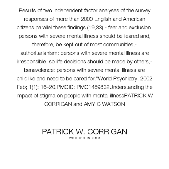Results of two independent factor analyses of the survey responses of more than 2000 English and American citizens parallel these findings (19,33):- fear and exclusion: persons with severe mental illness should be feared and, therefore, be kept out of most communities;- authoritarianism: persons with severe mental illness are irresponsible, so life decisions should be made by others;- benevolence: persons with severe mental illness are childlike and need to be cared for."World Psychiatry. 2002 Feb; 1(1): 16–20.PMCID: PMC1489832Understanding the impact of stigma on people with mental illnessPATRICK W CORRIGAN and AMY C WATSON
