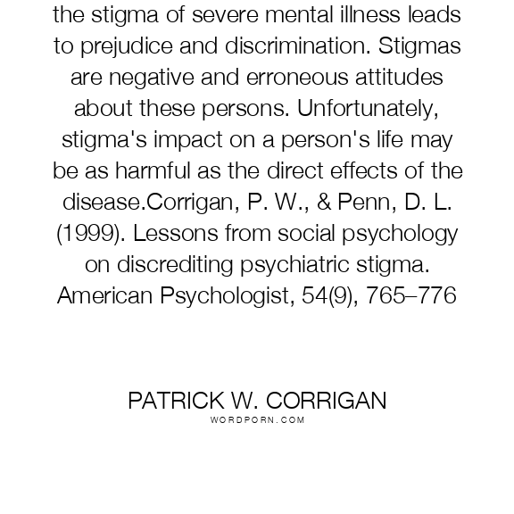 the stigma of severe mental illness leads to prejudice and discrimination. Stigmas are negative and erroneous attitudes about these persons. Unfortunately, stigma's impact on a person's life may be as harmful as the direct effects of the disease.Corrigan, P. W., & Penn, D. L. (1999). Lessons from social psychology on discrediting psychiatric stigma. American Psychologist, 54(9), 765–776