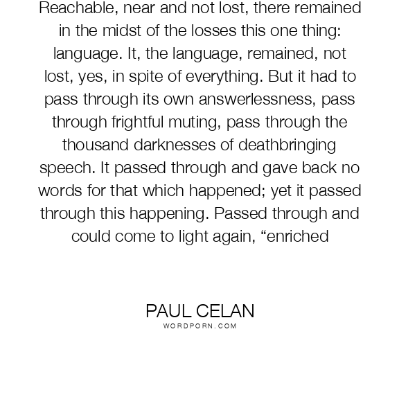 Reachable, near and not lost, there remained in the midst of the losses this one thing: language. It, the language, remained, not lost, yes, in spite of everything. But it had to pass through its own answerlessness, pass through frightful muting, pass through the thousand darknesses of deathbringing speech. It passed through and gave back no words for that which happened; yet it passed through this happening. Passed through and could come to light again, “enriched