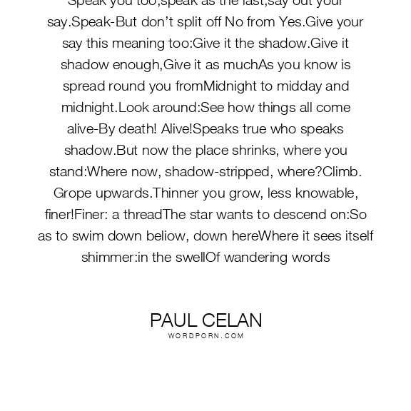 Speak you too,speak as the last,say out your say.Speak-But don’t split off No from Yes.Give your say this meaning too:Give it the shadow.Give it shadow enough,Give it as muchAs you know is spread round you fromMidnight to midday and midnight.Look around:See how things all come alive-By death! Alive!Speaks true who speaks shadow.But now the place shrinks, where you stand:Where now, shadow-stripped, where?Climb. Grope upwards.Thinner you grow, less knowable, finer!Finer: a threadThe star wants to descend on:So as to swim down beliow, down hereWhere it sees itself shimmer:in the swellOf wandering words